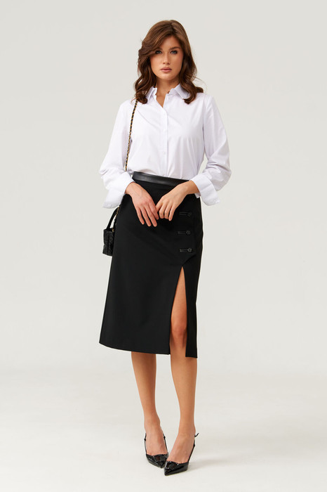 Переднее полотнище украшено декоративной шлицей с застежкой на обметанные петли и пуговицы в рамку с кожаными вставками, а также имеет вырез вдоль шлицы, что добавляет образу изящества и оригинальности. Задняя часть юбки украшена четырьмя талиевыми вытачками и средним швом, что обеспечивает аккуратный и элегантный силуэт. Юбка полностью на поливискозной подкладке, что делает ее более удобной и приятной к телу. Этот стильный и практичный вариант юбки черного оттенка отлично подойдет для создания повседневных образов с нотками изящества и современного стиля.