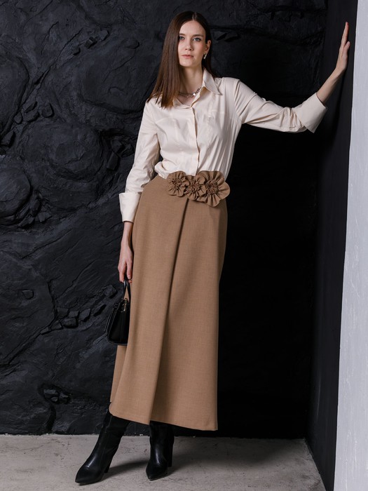 Модель А-образного силуэта, без подклада. Спереди карманы в подрезных бочках. По талии заложена складка, имитирующая запах, фиксированная декоративной пуговицей. Сзади в среднем шве застёжка на потайную молнию и высокий разрез.