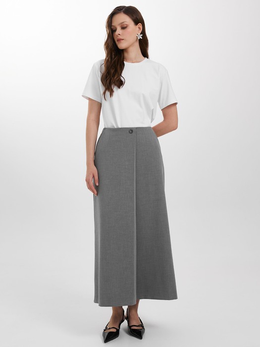 Модель А-образного силуэта, без подклада. Спереди карманы в подрезных бочках. По талии заложена складка, имитирующая запах, фиксированная декоративной пуговицей. Сзади в среднем шве застёжка на потайную молнию и высокий разрез.