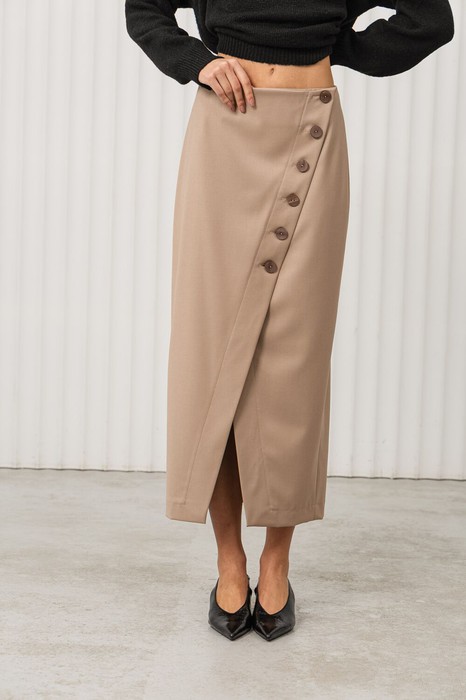 Дизайн: юбка-карандаш с асимметричным разрезом и декоративными пуговицами на боку. Классический крой и строгий силуэт подчеркивают женственность и элегантность;