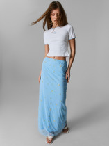 Юбка женская прямого силуэта из гипюра, на притачном поясе, длиной миди. В левом боковом шве застежка на потайную молнию.  Юбка на подкладке из атласа. В боковых швах юбки разрезы.