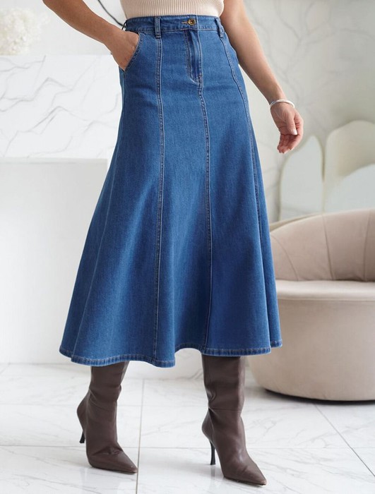Эффектная юбка миди А силуэта выполнена из эластичного денима, что обеспечивает комфорт и легкость движений на каждый день. Невероятно женственная юбка глубокого синего цвета с декоративными плоскими швами по всей длине визуально вытягивает фигуру, два боковых шва расположены под наклоном, что еще больше стройнит силуэт и подчеркивает бедра, создавая гармоничный силуэт. Декоративные швы придают особый акцент образу, делая его современным и стильным. Благодаря универсальному фасону расклешенная юбка подходит для худеньких девушек. Эластичная ткань легко адаптируется под особенности фигуры, не стесняет движений и держит форму в течение длительной носки, натуральный материал отличается высокой износостойкостью и обеспечивает отличную воздухопроницаемость