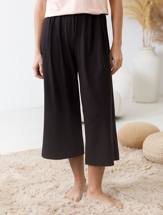 Состав: 100%Хлопок Плотность: 140 Г/м2Комфортные укороченные широкие брюки кюлоты черного цвета на тонкой резинке выполнены из 100% хлопка плотностью 140 Г/м2. Главная особенность этого изделия — тонкое кулирное полотно, которое легче и воздушнее стандартного трикотажа. Благодаря своей деликатной текстуре модель идеально подходит для домашних образов и пижамных комплектов. Ткань отлично «дышит», обеспечивая максимальный уют во время сна и отдыха. Эти свободные брюки обеспечивают максимальную свободу движений благодаря широкому крою. Эластичная резинка в области талии гарантирует удобную посадку и индивидуальное прилегание по фигуре. Защипы добавляют выразительность образу и помогают сформировать актуальный силуэт, подчеркивая современные тенденции. Повседневные брюки подходят для больших размеров, мягко скроют возможные недостатки фигуры, подчеркивая комфорт и стиль. Домашние брюки кюлоты отлично сочетаются с разными вариантами верхней одежды, поэтому их можно носить не только дома, но и на прогулках. Удобные брюки созданы для тех, кто ценит комфорт и практичность без лишних деталей.