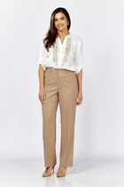Брючины слегка заужены к низу, на щиколотках — плотные манжеты, благодаря которым обладательницам этих брюк не страшны ни снег, не холодный ветер. Пояс -резинка, внутри имеется шнурок для регулировки талии, два боковых кармана на молнии.