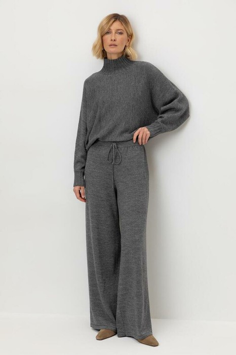 Пояс регулируется вязаным шнуром в тон брюк. Плотная фактура вязания согревает и сохраняет форму во время носки.