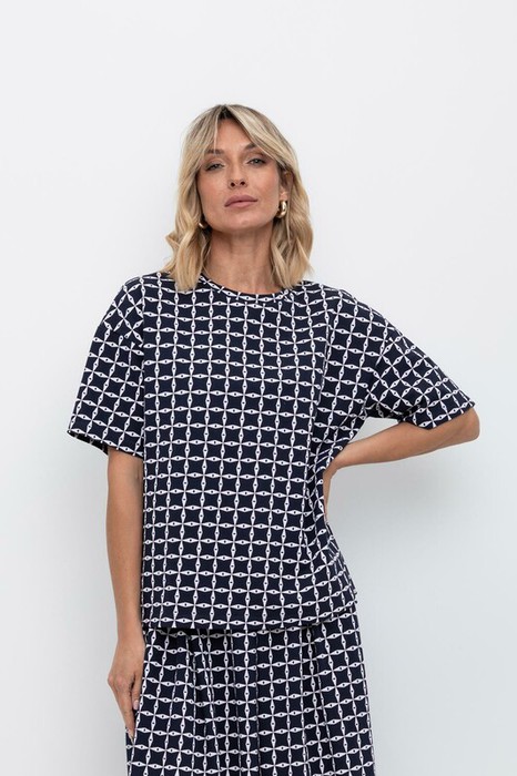Свободная футболка из набивного пике из длинноволокнистого гребенного хлопка. Спущенное плечо придает изделию свободный силуэт.