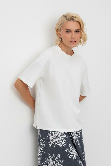 Блуза прямого силуэта со спущенным рукавом, изготовленная из премиального трикотажного полотна DOUBLE FACE. Мягкий на ощупь трикотаж выполнен из высококачественной гребенной пряжи.