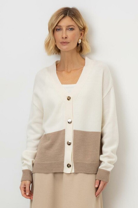 Вязаный кардиган из шерсти с добавлением акрила. Гладкая фактура вязания сохраняет форму, а манжеты и нижний край не растянутся благодаря вывязанной резинке.