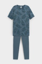 Комплект для сна и отдыха. Удлиненная футболка комфортно садится по фигуре. Бриджи из меланжевого трикотажа с добавлением лайкры с мягким поясом на резинке.