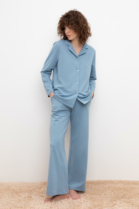 Комплект для комфортного сна и отдыха из однотонного трикотажа с содержанием полиэстера. Рубашка с длинными рукавами на пуговицах. Брюки с мягким поясом на резинке. Гладкий материал приятен к телу, не теряет форму и позволяет коже дышать.