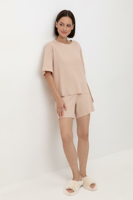 Комплект из объемного трикотажа с добавлением эластичных волокон. Свободный силуэт и мягкий пояс  обеспечат комфорт во время сна и отдыха.