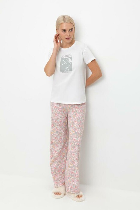 Комплект из высококачественного гребенного хлопка. Свободный крой брюк дополнен широким, удобным поясом, а футболку молочного цвета украшает мягкий на ощупь принт, который выполнен на основе  водных красок, что обеспечивает устойчивость к многократным стиркам.