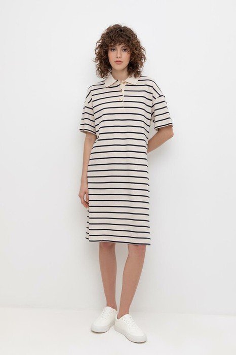 Трикотажное платье-поло в полоску из длинноволокнистого гребенного хлопка. Спущенное плечо придает изделию свободный силуэт.