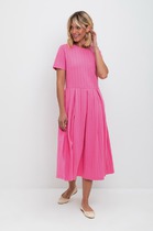 Легкое свободное платье с круглым вырезом на сборке, короткими рукавами из набивного трикотажа супрем.