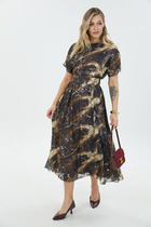 Легкое свободное платье с круглым вырезом на сборке, короткими рукавами из набивного трикотажа супрем.