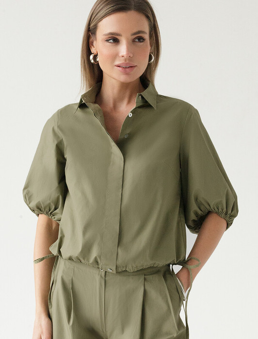 Укороченная блузка с пышными рукавами-фонариками выполнена из легкого хлопкового поплина. Супатная застежка на пуговицы из натурального перламутра. Внизу кулиса с лентами из основного полотна. В изделии будет комфортно, даже в самое жаркое время года. Подходит для любой фигуры. Сочетается в костюме с кюлотами D24.233 и юбкой D26.179