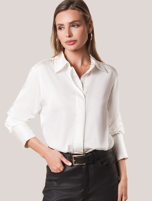 Сатиновая блузка с эластаном натруального белого цвета – воплощение элегантности и комфорта. Благородный блеск сатина добавляет образу шика, а эластичность материала гарантирует удобство при носке. Прямой силуэт блузки обеспечивает комфорт, а эластичность материала предотвращает деформацию. Застежка-планка с потайными пуговицами придает модели аккуратность. Универсальный вариант для casual-образов.