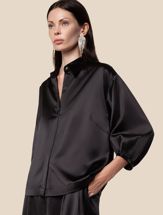 Блузка выполнена из струящегося сатина напоминающий натуральный шелк. Модель с застежкой планкой дополнена золотистыми пуговицами на манжетах и воротнике. Расслабленный силуэт поддерживает спущенная линия плеча и рукава с небольшими фонариками. Спинка изделия чуть длиннее. Сочетайте в костюме с юбкой D26.193 и брюками D24.221 чтобы создать роскошный праздничный образ. В комплекте с джинсами или любым другим низом из гардероба, для повседневного образа.