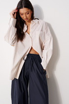 Блузка светло-оливкового цвета сочетает в себе комфорт и элегантность благодаря материалу из вискозы с лиоцеллом. Аккуратный отложной воротник подчеркивает утонченность образа, а продолговатые металлические пуговицы золотистого цвета добавляют выразительный акцент и придают блузке благородный вид. Широкие манжеты на рукавах привлекают внимание и делают силуэт современным. Спущенная линия плеча формирует расслабленный, но стильный внешний вид, что идеально для тех, кто ценит индивидуальность и уверенность в деталях. Крой продуман так, чтобы подчеркивать достоинства фигуры и на больших размерах, создавая гармоничный силуэт без лишних усилий. Ткань из вискозы с добавлением лиоцелла обеспечивает приятные ощущения и отличную посадку, струится на теле и охлаждает в жаркую погоду. Рубашка легко впишется как в деловой гардероб, так и в повседневный стиль, позволяя выглядеть безупречно независимо от ситуации.