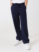 Черные брюки-кюлоты выполнены из плотного хлопкового твила, матовая фактура которого передает насыщенность цвета. Такой материал не нарушает лаконичный вид модели, поэтому она впишется в строгий школьный образ и в тоже время, будет хорошо сочетаться с яркими футболками. Объем в талии регулируется перфорированной резинкой в поясе, перестёгивающейся на пуговицу.
