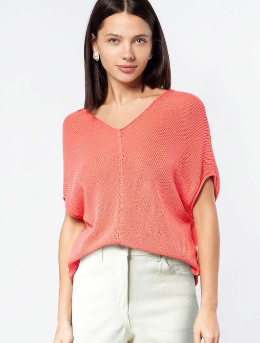 Джемпер фактурной вязки из пряжи на основе крученой вискозы с лиоцеллом. Спущенная линия плеч подчеркивает расслабленный и непринужденный стиль. Шелковистое но достаточно плотное изделие, приятно ощущается на теле, поэтому в нем будет комфортно даже на голое тело в жаркое время года.