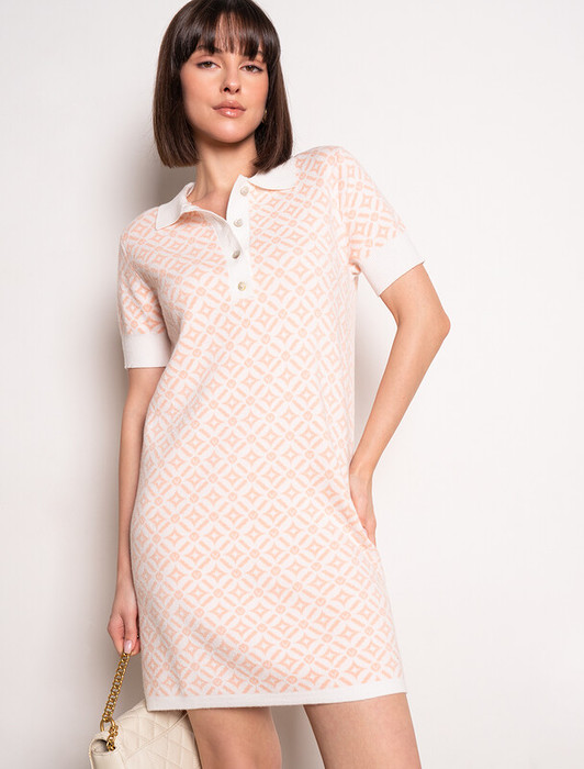 Платье длины мини с воротником поло выполнено из мягкого трикотажа на основе шелковистой эластичной вискозы. Жаккардовое переплетение образует геометрический узор. Застежка на перламутровые пуговицы подчеркивает гладкость пряжи. Контрастный воротник и манжеты делают узор еще более выразительным. Можно сочетать с жакетом D31.388 из жаккардовой коллекции.