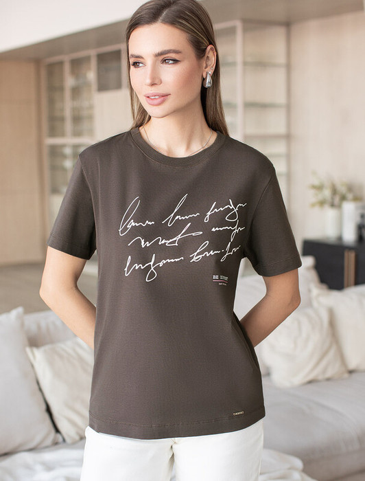 Совместные покупки Каменск-Уральский Женская одежда Футболки — Vilatte Футболка из премиального хлопка с авторским принтом D49.983 кофе_be diff