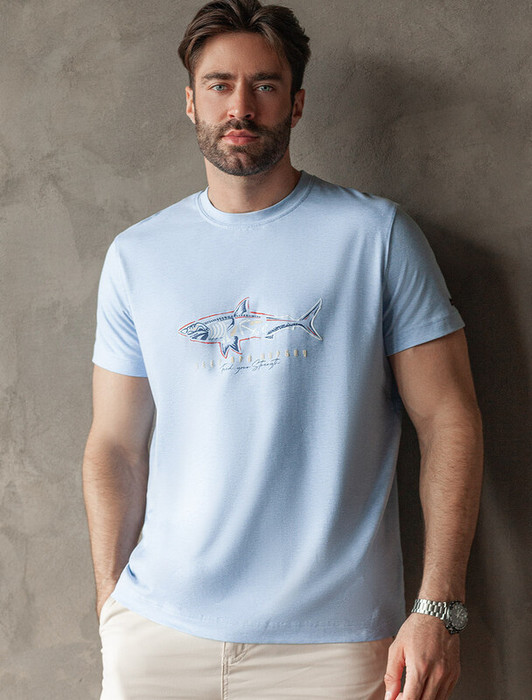Совместные покупки Каменск-Уральский Мужская одежда Футболки — Vilatte Футболка из премиального хлопка с авторским принтом U49.045 голубой мела