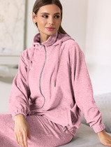 Худи на двухсторонней молнии выполнено из бархатистого велюра. Модель дополнена резинкой по низу и боковыми карманами. Легкий и мягкий материал с матовой фактурой придает изделию нежность и комфорт. Хорошо держит тепло и форму – идеальное решение для домашнего отдыха. Сочетается в костюме с брюками D44.117