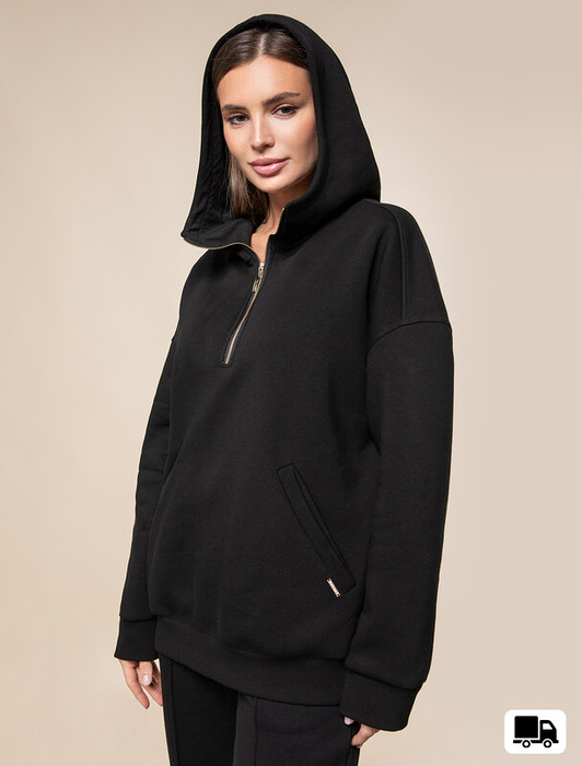Худи с воротом на молнии выполнено из премиального футера трехнитки с теплым начесом. Модель дополнена боковыми карманами и золотистой фурнитурой, что поддерживает актуальный стиль спорт-шик. Свободный крой подходит для любой фигуры. Ранней осенью или поздней весной можно носить в качестве верхней одежды. Сочетается в костюме с брюками D44.133.