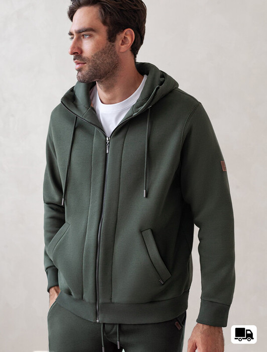 Худи на молнии выполнено из премиального эластичного футера трехнитки с теплым начесом. Модель с капюшоном и воротом стойка дополнена боковыми карманами и нашивкой с логотипом бренда из эко-кожи. Ранней осенью или поздней весной можно носить в качестве верхней одежды. Высококачественная фурнитура цвета темное серебро. Изделие сочетается в костюме с брюками U44.006