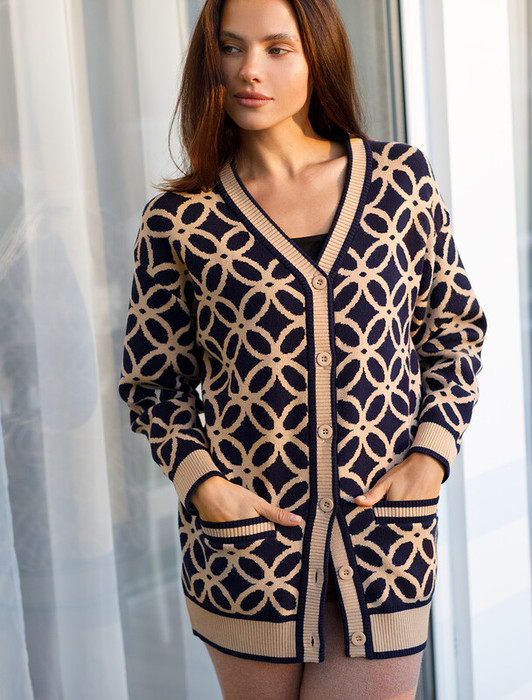 Совместные покупки Каменск-Уральский Женская одежда Кофты, кардиганы — Vilatte Кардиган двуслойной жаккардовой вязки с кашемиром D31.130 синий-бежевый