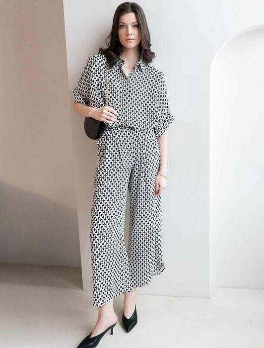 Кюлоты с разрезами выполнены из тонкого лиоцелла. Модель дополнена двумя карманами по бокам и эластичным поясом на резинке. Приятная на ощупь тонкая ткань охлаждает кожу и успокаивающе действует на нее, а крой не ограничивает свободу движений. Графичный  принт поддерживает легкий блеск ткани.