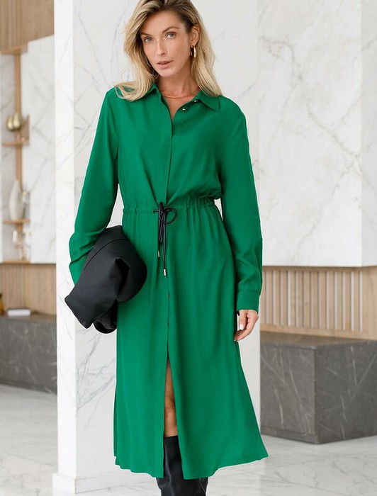 Платье А-силуэта с отложным воротником как у рубашки выполнено из лиоцелла с вискозой. Лаконичная модель с потайной застежкой на пуговицы дополнена боковыми карманами и поясом-шнуром из эко-кожи.Ткань поддерживает оптимальный микроклимат, поэтому изделие подходит для любого сезона.