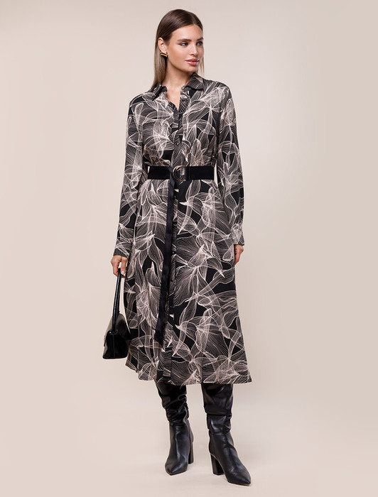 Платье А-силуэта с отложным воротником как у рубашки выполнено из премиальной вискозы. Модель с графичным растительным принтом дополнена удобными боковыми карманами и поясом из репсовой ленты. Застежка на золотистые пуговицы во всю длину изделия позволяем создать спереди нужный разрез. Материал – очень приятен к телу именно в осеннее время за счет его особенного плетения создает уютный обволакивающий эффект и в тоже время не теряет своей легкости.