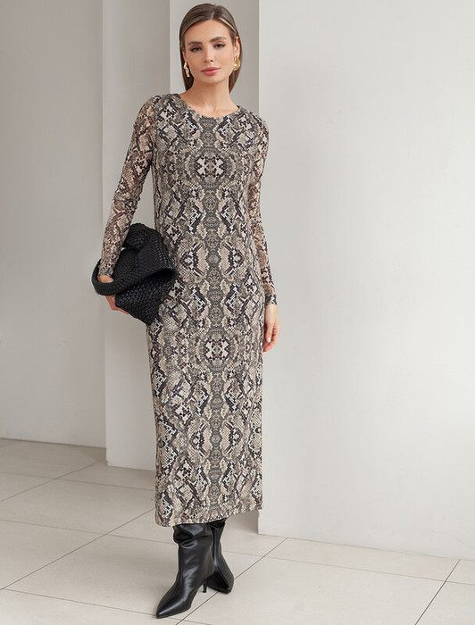 Совместные покупки Каменск-Уральский Женская одежда Платья — Vilatte Платье из сетки с подкладкой D22.238 коричневый-бежевый змея