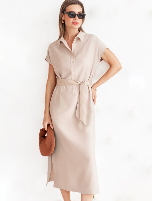 Платье-рубашка выполнено из плотного лиоцелла. Модель прямого кроя дополнена поясом из репсовой ленты в тон изделия. Деликатный блеск ткани подчеркивают пуговицы из натурального перламутра. Ткань хорошо держит форму, плавно драпируется и не просвечивает. В теплое время года приятно охлаждает кожу. Добавление синтетических волокон в составе изделия, предотвращает сминаемостьи поддерживает формоустойчивость.