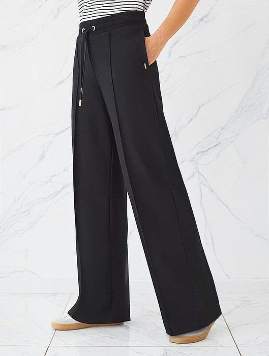 Брюки прямого кроя выполнены из премиального футера-двухнитки. Лаконичный силуэт поддерживают застроченные стрелки, зрительно вытягивающие силуэт. Удобный пояс на резинке регулируется хлопковым шнурком с золотистой фурнитурой. Наличие эластана в составе изделия гарантирует комфорт и долговечность изделия. Свободные брюки хорошо будут сочетаться в костюме с футболкой D49.074 и паркой D49.076