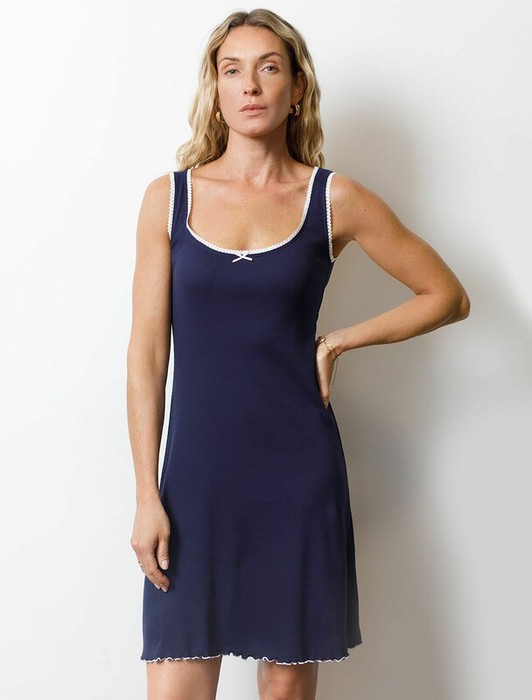 Сарафан темно-синего цвета длины мини с вырезом из эластичного трикотажа кашкорсе создан для современных женщин, ценящих красоту и удобство. Крой выгодно подчеркивает фигуру и создает женственное настроение в образе. Благодаря отделке нежным кружевом сарафан выглядит по-особенному романтично и изысканно. Трикотаж кашкорсе обеспечивает комфортное ощущение в течение дня как дома, так и на отдыхе. Этот домашний сарафан подойдет для спокойного вечера в кругу семьи, а так же для отдыха и сна. Мягкая ткань трикотажа приятна на ощупь и создает ощущение уюта. Любое движение свободно благодаря эластичному составу, который помогает сохранить форму даже после долгой носки. Легкий аккуратный волан по низу придает платью на широких лямках интересный акцент.