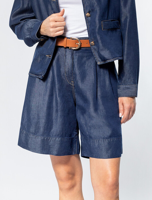 Шорты "бермуды" выполнены из струящегося 100% лиоцелла. Деним из такого материала обладает особой мягкостью и прочностью. Имеет полуматовый блеск, как у натурального шелка. Отлично холодит кожу в жаркое время года, сохраняя комфортный микроклимат. Глубокий синий цвет без стирки дополнен золотистой фурнитурой в стиле old-money. Сочетается в костюме с жакетом D51.030