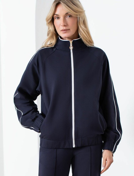 Свободный бомбер темно-синего цвета на молнии выполнен из премиального футера двухнитки плотностью 240 Г/м2. Натуральный состав обеспечивает хорошую воздухопроницаемость, мягкость и приятные тактильные ощущения, Эластичный материал олимпийки позволяет свободно двигаться без лишнего стеснения, а также отлично сохраняет форму даже после длительного ношения. Манжеты на рукавах и резинка по низу обеспечивают надежную посадку, сохраняя тепло в прохладную погоду. Повседневный бомбер отличается универсальной длиной, которая идеально подходит для повседневного и спортивного образа. Контрастные лампасы на рукавах придают образу динамику и визуально вытягивают силуэт, делая модель актуальной. Прорезные карманы по бокам добавляют функциональности, сохраняя при этом стильный внешний вид. Представленная размерная линейка позволяет подобрать оптимальный вариант для любой фигуры и размера, на маленький или плюс сайз, обеспечивая идеальную посадку без компромиссов по стилю. Эта зипка на молнии станет отличным дополнением к