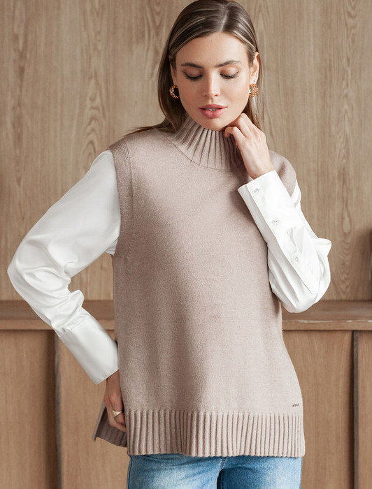 Жилет с воротом стойка выполнен из мягкой пряжи с кашемиром. Модель дополнена боковыми разрезами. Хорошо сочетается лонгсливами и блузками. Мягкая пряжа очень приятная к телу, поддержит комфорт на протяжении всего дня, при этом не перегревая. Сочетается в костюме с брюками D38.013, D38.012 и юбкой D36.016