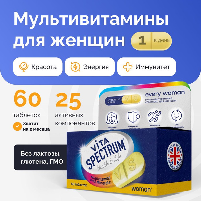 Розничная цена от 1090. VITASPECTRUM Every Woman — витаминно-минеральный комплекс, сбалансирован с учетом суточной потребности женского организма в витаминах и минералах.