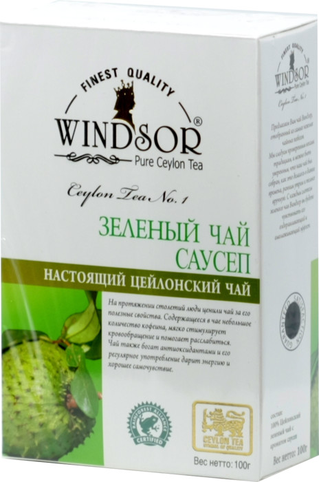 Зеленый крупнолистовой чай «Виндзор» - «Саусеп». Отличный чай для поклонника настоящего цейлонского чая, выращенного на высокогорье. Обладает крепостью и обогащен маслом саусепа – классическая натуральная добавка – выдержка из тропического фрукта – саусеп. Чай имеет приятный ненавязчивый вкус, сохраняет все витамины и полезные для организма вещества, прекрасно снимает усталость.Способ приготовления: чай заваривают из расчёта 1 чайная ложка чая на 200-250 мл воды. Зелёный чай заливают горячей кипячённой водой (80 градусов Цельсия) и настаивают 3-5 минут. После этого добавляют сахар, мёд, лимон, по вкусу.