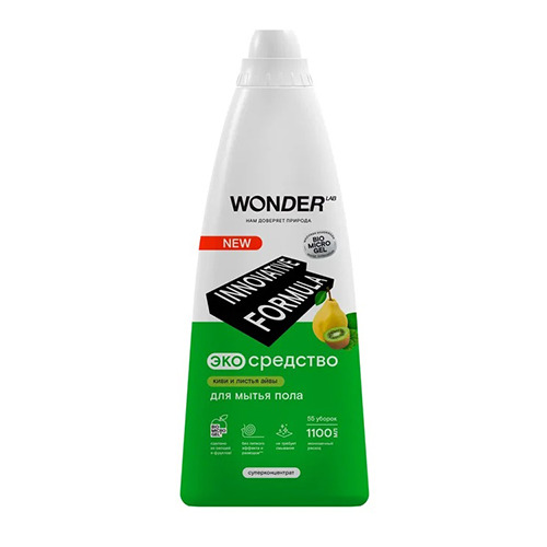 Безопасное и инновационное экосредство для мытья пола WONDER LAB киви и листья айвы подходит для мытья полов с любым покрытием. Средство эффективно удаляет все возможные загрязнения с линолеума, ламината, керамической плитки, мрамора, паркета. Экосредство экономично расходуется благодаря концентрированной формуле.