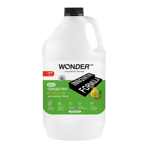 Безопасное и инновационное экосредство для мытья пола WONDER LAB киви и листья айвы подходит для мытья полов с любым покрытием. Средство эффективно удаляет все возможные загрязнения с линолеума, ламината, керамической плитки, мрамора, паркета. Экосредство экономично расходуется благодаря концентрированной формуле.