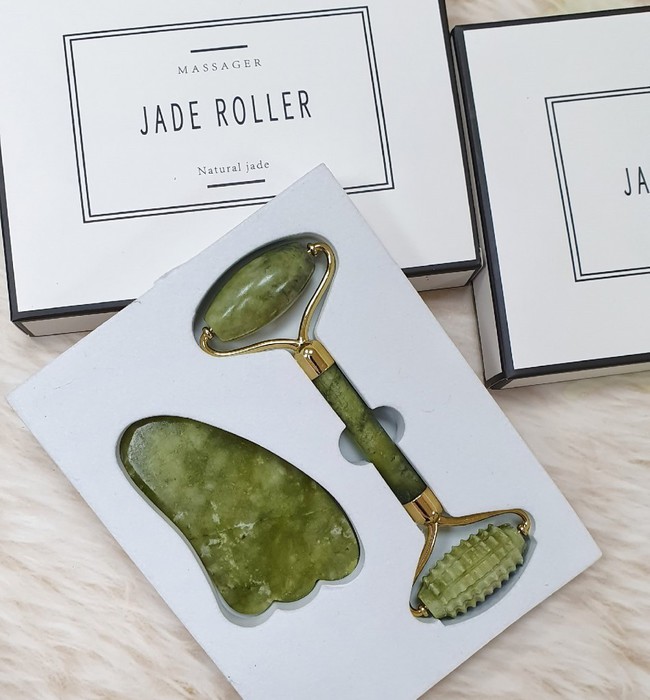 (ЗАМЯТА КОРОБКА) Набор Роллер нефритовый гладкий + с колючками и скребок ГуаШа