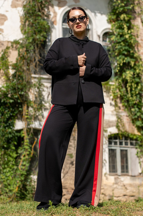 Соременный жакет на подкладке из премиум трикотажа, с центральной бортовой застёжкой на петли и пуговицы. Горловина круглой формы. рукава притачные с отложными манжетами.  По  низу спинки  обработана кулиса  с эластичной резинкой, на полочках  карманы в подрезе. Рукава втачные со всатвками по центру рукавов, по низу с притачной манжетой с эластичной резинкой. Спинка цельная.   прямого кроя, на притачном поясе по переду и с резинкой по спинке.