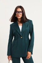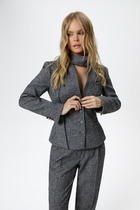 Жакет свободного силуэта с застежкой по переду на кнопки. Воротник отложной. По переду отрезные кокетки, накладные карманы с клапанами. По спинке кокетка и рельефы. Рукав двухшовный с притачной манжетой на кнопках. Низ жакета на притачном поясе.