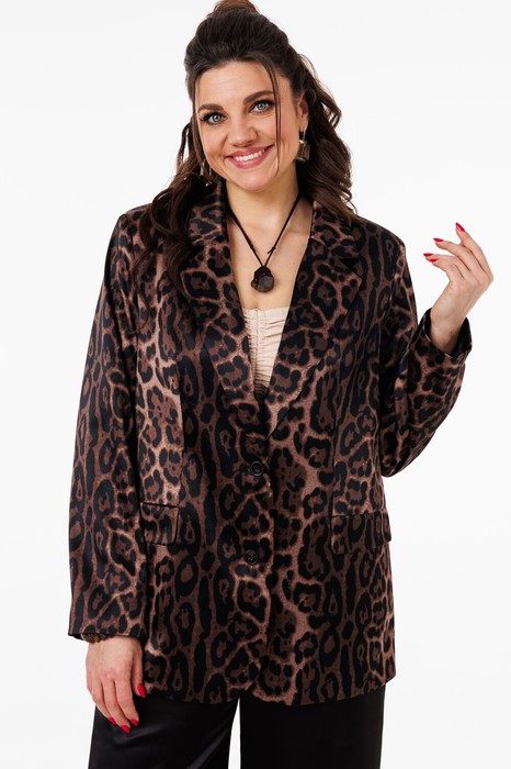 Строгий крой жакета гармонично сочетается с диким принтом, создавая интересный контраст. Удобные карманы сохраняют лаконичность силуэта, а качественная подкладка обеспечивает комфорт при носке.